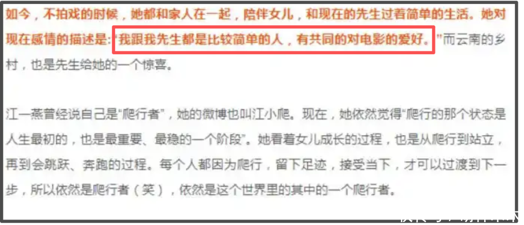 但是直到2022年,江一燕接受媒体采访的时候,才吐露自己已经结婚,还表示和赵汉唐都是比较简单的人,有共同对电影的爱好,定居在云南的某个乡村里,生活很惬意。